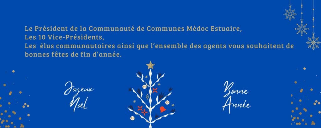Le Président de la Communauté de Communes Médoc Estuaire, les 10 Vice-Présidents, les élus communautaires ainsi que l'ensemble des agents vous souhaitent de bonnes fêtes de fin d'année.