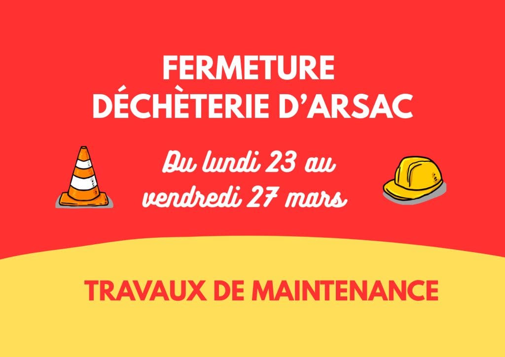 Afin d’améliorer les équipements et de réaliser des travaux de maintenance, la déchèterie d’Arsac sera exceptionnellement fermée du lundi 23 mars au vendredi 27 mars inclus.